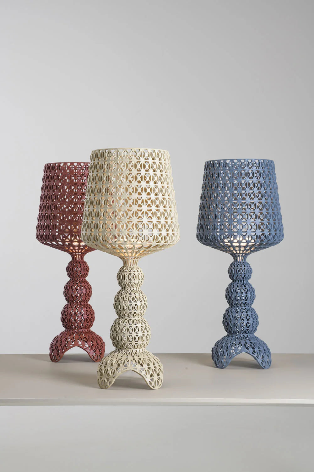 La Lampada Mini Kabuki è realizzata ad iniezione che consente di avere una struttura a trama che riproduce il pizzo con una particolare superficie traforata da cui si diffonde la luce.