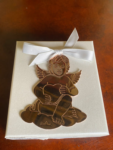 Medaglione culla per bambini\e con angelo, placcato in argento rosato e protetto con vernice antiossidante. Si consiglia la pulizia solamente con un panno morbido per rimuovere la polvere.